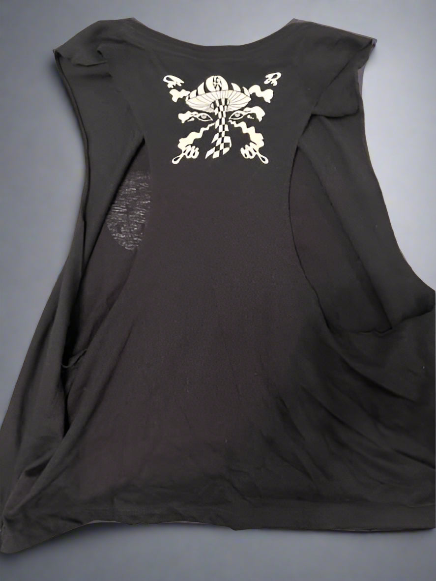 A lightweight black crop tank with a breezy, flattering fit. The front features the circular “TRB” logo in white, while the back shows off a small mushroom design centered between the shoulders for just the right amount of detail. Perfect for warm weather, workouts, or your next show.